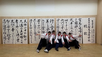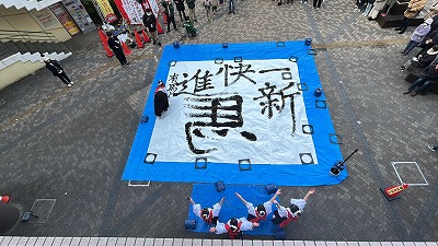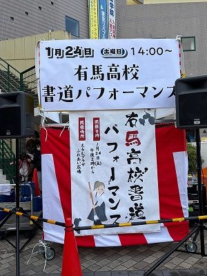 1月24日(土)ウッディダウン南駅前のえるむプラザふれあい広場にて、書道パフォーマンスを行わせていただきました。放送部部長の司会で、今年130周年を迎える有馬高校の紹介や書道部員のインタビューなどもあり、寒い中でしたがたくさんの方々に観ていただきました。